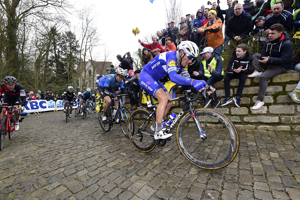 After 120 kilometres of racing, the eleven leaders started the Oude Kwaremont - the first of 18 Hellingen climbs - but it was approaching Geraardsbergen that the pace picked up again. Last year, the race was opened up on the Muur with a surge from Quick-Step Floors. This time, a massive crash in the approach to Geraardsbergen was the key event. Former double winner Stijn Devolder, Ian Stannard (Team Sky) and favourite Oliver Naesen (AG2R La Mondiale) were amongst the victims of the crash but they continued the race. There were no attacks on the Muur, where a strong Tiesj Benoot led the peloton on the final part. Naesen had a lot of work on his plate to make it back in the peloton. This year's race was a far more tactical race as the riders tackled more cobbled climbs in the rain.