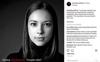 However, Pinarello's offensive Nytro ad continued on its official instagram account that showed a portrait of a young woman with a caption that read: Emma, 24 years old, “Couple Rider”. Alongside the photo was a post that read, “I’ve always wanted to go cycling with my boyfriend but it seemed impossible. Soon everything will become possible.”