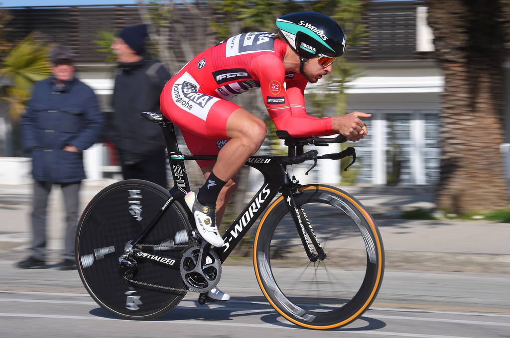 All Tirreno-Adriatico points classification leader Peter Sagan (Bora-Hansgrohe) had to do in the final stage time trial was cruise in to the finish inside the time cut to take home the red jersey. But that almost didn't happen when a pedestrian walking a dog crossed the road directly in front of the Slovakian, who was bearing down on the hapless person at 60kph.