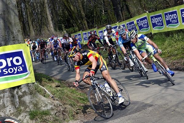 The race started to really take shape over the top of the second passage of the Kemmelberg, where Capelli had 45" over Pozzato and Gilbert. A group formed with Alessandro Ballan (Lampre) and Juan Antonio Flecha (Rabobank), they got a small gap over the main group, which was being led by Rabobank for Freire.