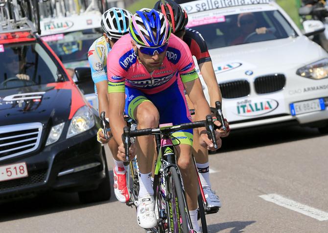 The eleven had a margin of 30 seconds over the peloton when Scarponi led them over the summit and they stretched that out to 1:30 on the descent. Sky and Cannondale initially kept tabs on the move but when they relented, the gap rose to 3:30 with 50km still to go. Vini Fantini-Selle Italia and NetApp-Endura took up responsibility for the chase at that point and their pursuit brought the break’s advantage down to two minutes as they hit the short, sharp climb of the Daone.