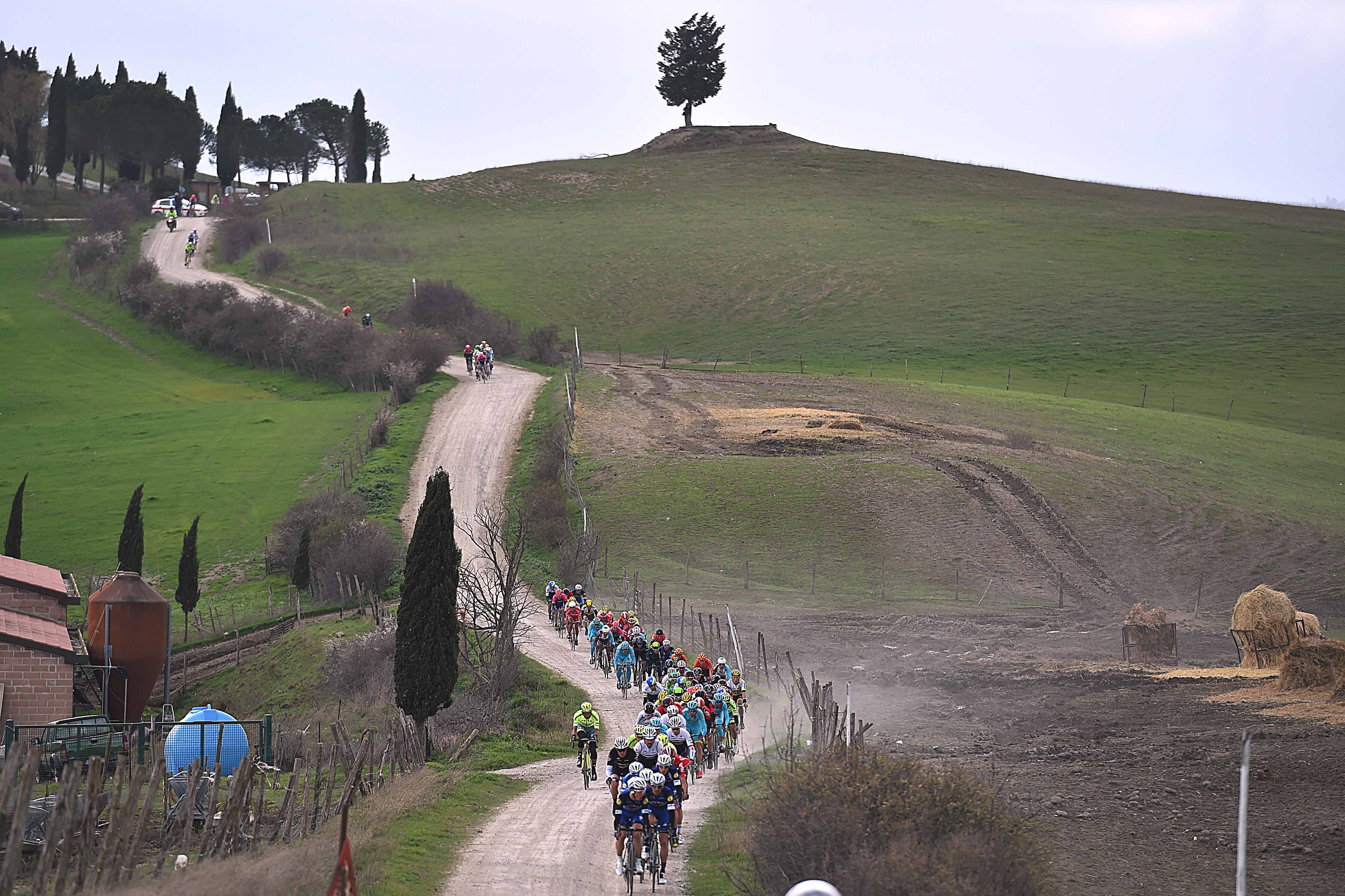 Damiano Cunego (Nippo- Vini Fantini) crashed hard on a sector of dirt road, reportedly fracturing his wrist. Other riders also crashed or suffered punctures, quickly taking them out of the race. Only 60 or so riders remained in the peloton as the crosswinds also shredded the peloton.