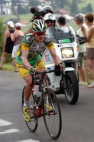 The American pushed the big chain ring up the Col des Saisies, while the front men disintegrated: Paolini and Le Mevel went out the back, as Le Mevel's teammate Halgand was the one doing the forcing. Soon, the leaders were reduced to seven riders: Patrik Sinkewitz (T-Mobile), Pavel Padrnos (Discovery Channel), Stuart O'Grady (Team CSC), Daniele Righi (Lampre-Fondital), Juan Manuel Garate, Patrice Halgand (Crédit Agricole) and Philippe Gilbert (Française Des Jeux).