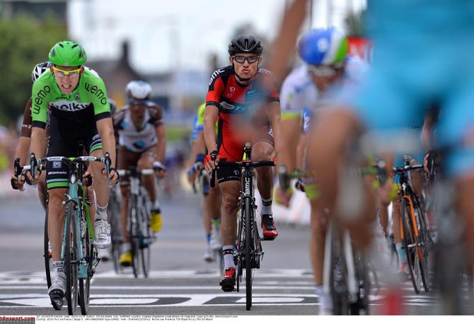 The peloton took off from York without Mark Cavendish (Omega Pharma-QuickStep) who was forced out of the race after a crash near the end of the first stage left him with a serious shoulder injury. He was at the start, his arm in a sling, as he briefly talked to the media before departing.
