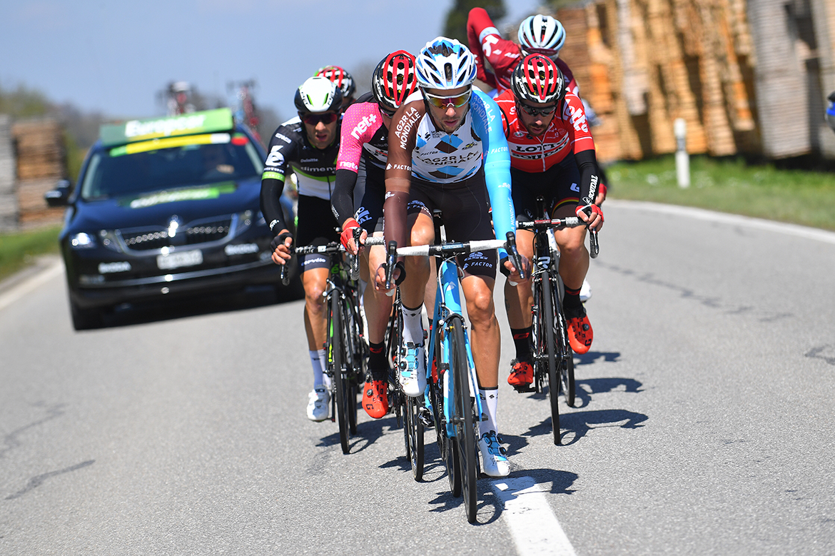 After the usual flurry of attacks after the starter’s flag dropped, a breakaway of eight slipped away that included Simon Clarke (Cannondale-Drapac), Pavel Kochetkov (Katusha-Alpecin), Tosh Van der Sande (Lotto Soudal), Sander Armee (Lotto Soudal), Thomas De Gendt (Lotto Soudal), Mickaël Chérel (AG2R La Mondiale), Youcef Reguigui (Dimension Data) and Andrea Pasqualon (Wanty - Groupe Gobert).