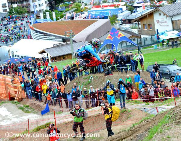 The crowd favourite four cross event did not disappoint the thousands of fans who lined the course. It was clear early on that the men's race was between the Swiss and the Czech riders. The two nations split the top four spots in qualifying and dominated the heats on the way to the final. Rinderknecht was joined by countryman David Graf for the final, with Czech teammates Tomas Slavik and Michael Mechura taking the other two spots.