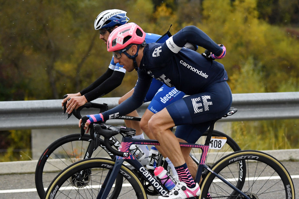 The descent was wet and nervous and saw small splits in both the breakaway, where Gorka Izagirre went clear, and in the peloton, where Andrey Amador’s pace was quick enough to see him and his Ineos Grandiers leader Richard Carapaz gain a small advantage.
