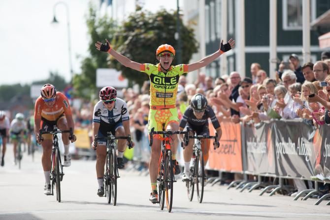 Emilia Fahlin (Ale Cipollini) sprinted to the win Sunday during Crescent Vargarda, the 15th round of the Women's World Tour. The 27-year-old Swedish rider claimed the win in her home country after making it into a nine-rider move that escaped on a dirt section late in the race, then outsprinted Lotta Lepistö (Cervelo Bigla) and Chantal Blaak (Boels Dolmans) at the line.