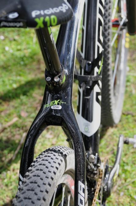 The Big.Nine is little changed from the 2012 bike, apart from the graphics. The top-end Team frame weighs about 1,100g, and Merida stress that a much lower weight is unrealistic when allowing for a 20mm thru-axle, longer frame tubes and the integrated internal cable routing that has silicone tubes within the frame designed to guide full length outer casing for ease of maintenance. A BB30 bottom bracket gives the racers all the stiffness they require, and the flat Flex Stay seatstays incorporate a layer of flax bio fibre that has slow rebound properties to damp vibration.