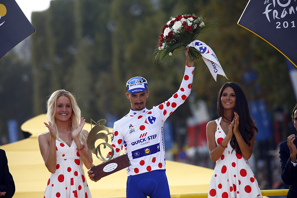 Julian Alaphilippe (Quick-Step Floors) on the final podium as the winner of the mountain classification at the Tour de France(Image credit: Bettini Photo)