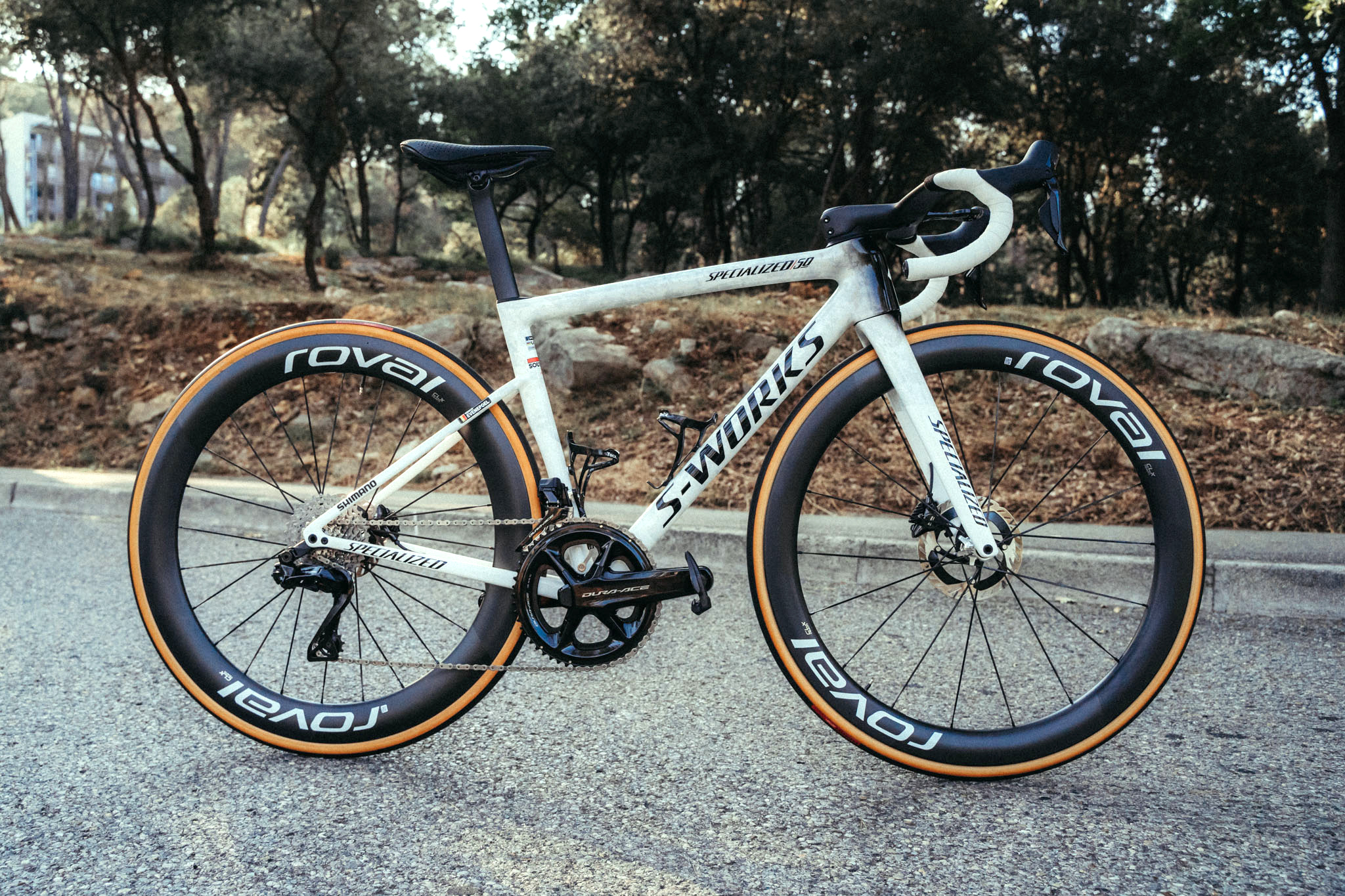 This bike was never used, because Evenepoel preferred to race an unpainted bike for the final stages as he tried to eke out a second place, but Specialized still painted him a special white-jersey-edition Tarmac SL8. (Image credit: Getty Images)