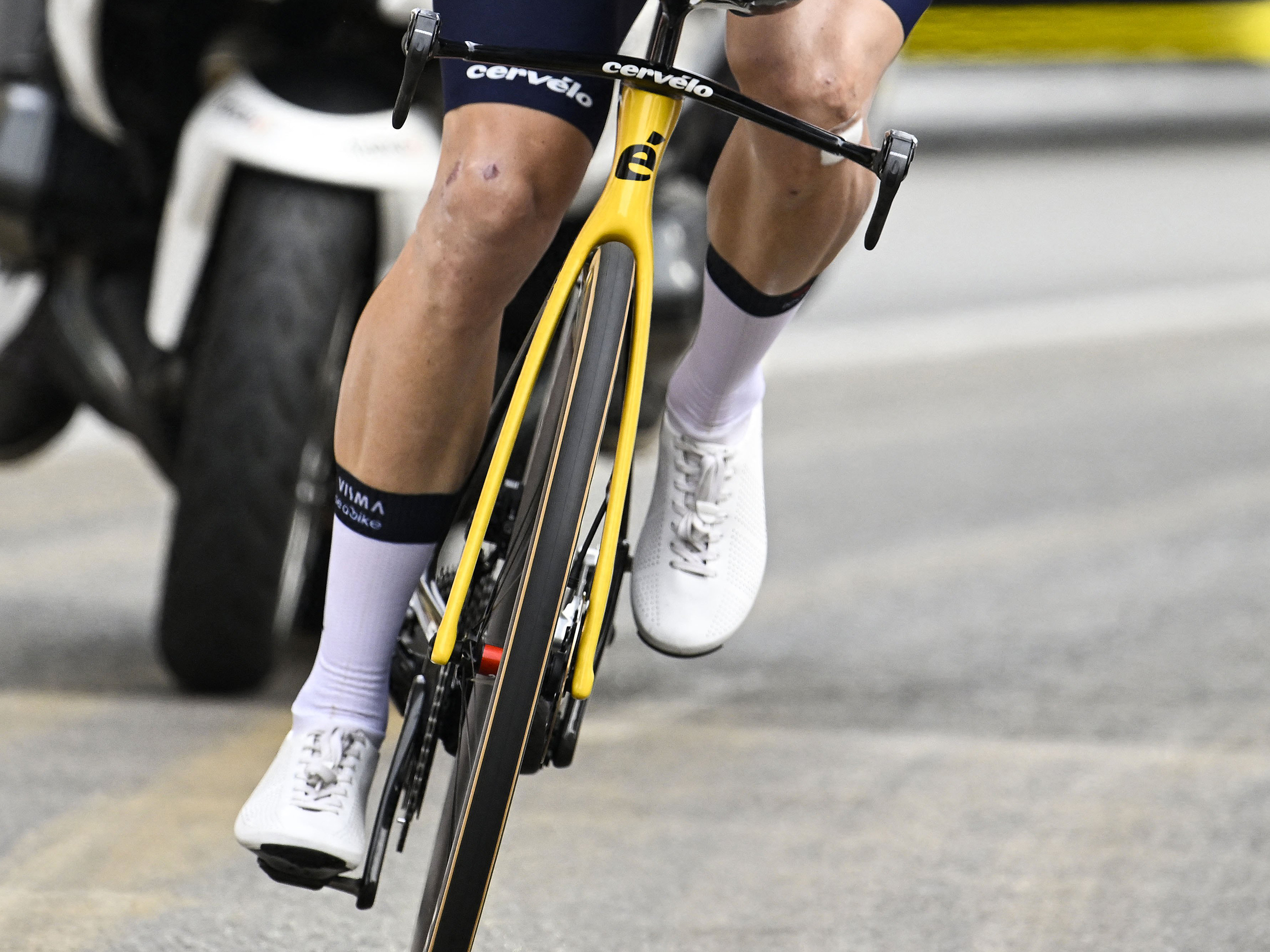 Another with an unpainted frame was the other GC contender of the race, Remco Evenepoel, whose Specialized Shiv TT is fitted here with what we believe is a new front wheel. It looks marginally deeper than the front wheel found in the existing Rapide CLX II pairing. It also looks to have a differently-shaped profile which actually resembles the rear wheel in the aforementioned pairing. Has Specialized simply laced a Rapide CLX II rear rim onto a front hub? Or has the brand got a new front wheel on the way? At the moment, we don't know. Elsewhere, Evenepoel is also running a short sleeve skinsuit. Commonly, long sleeves are proven faster, as the material can be modified to improve aerodynamics, but according to the team, Remco's bare arms actually tested faster. (Image credit: Getty Images)