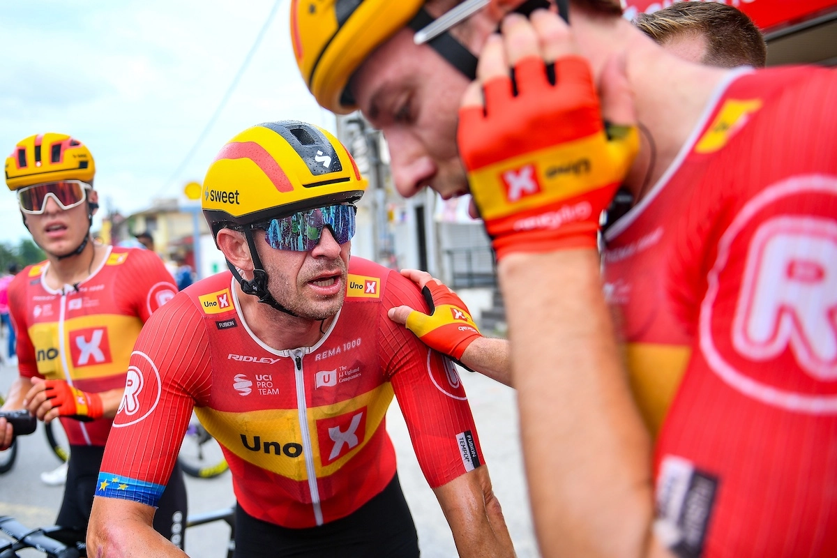 Visibly in pain as he stood on the side of the road, the rider quickly realised getting back on the bike was not an option and stepped away from racing for the last time, not with the hoped-for victory celebration but instead an injury.