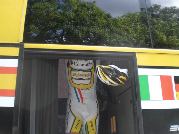 Sylvain Chavanel (Quick Step) looked resplendent in yellow, his freshly painted yellow and green bike the stand out feature by the Quick Step bus.