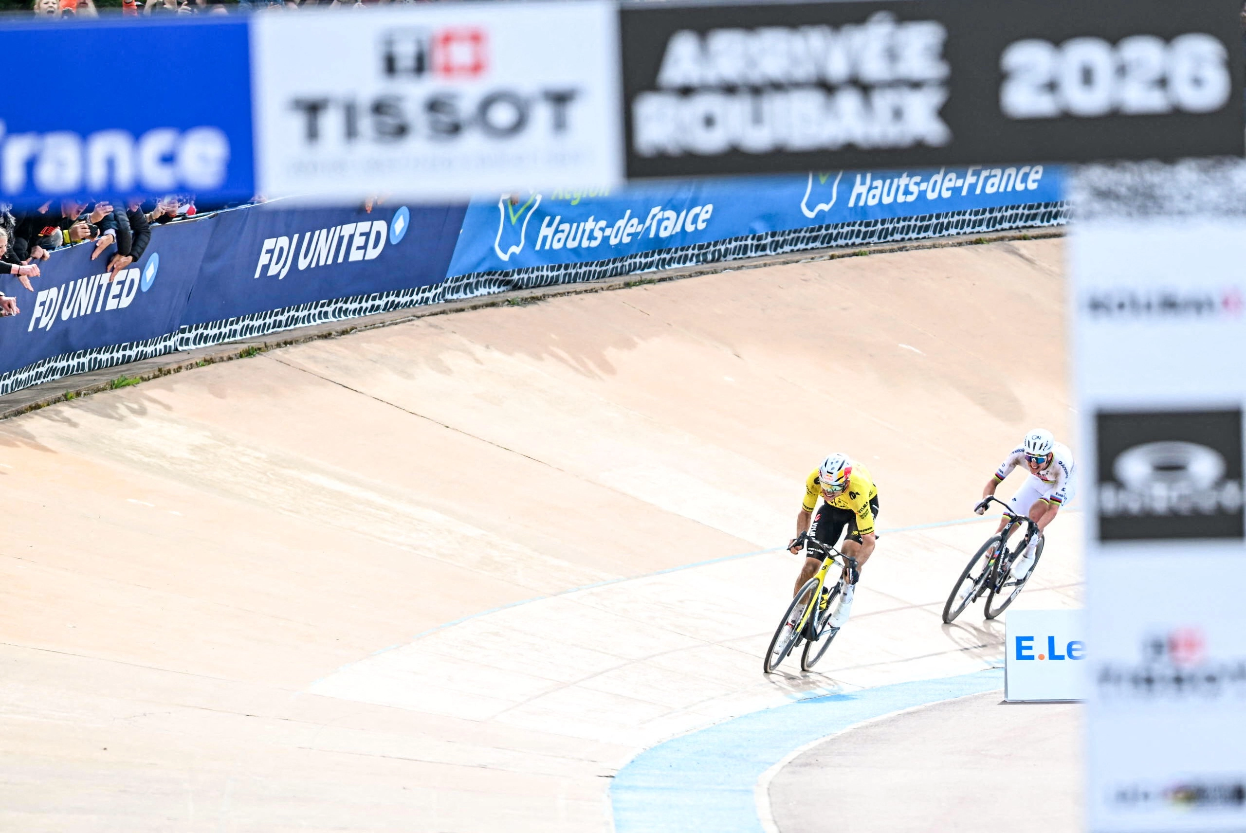 They head into the Vélodrome André-Pétrieux with Tadej Pogačar leading Wout Van Aert.