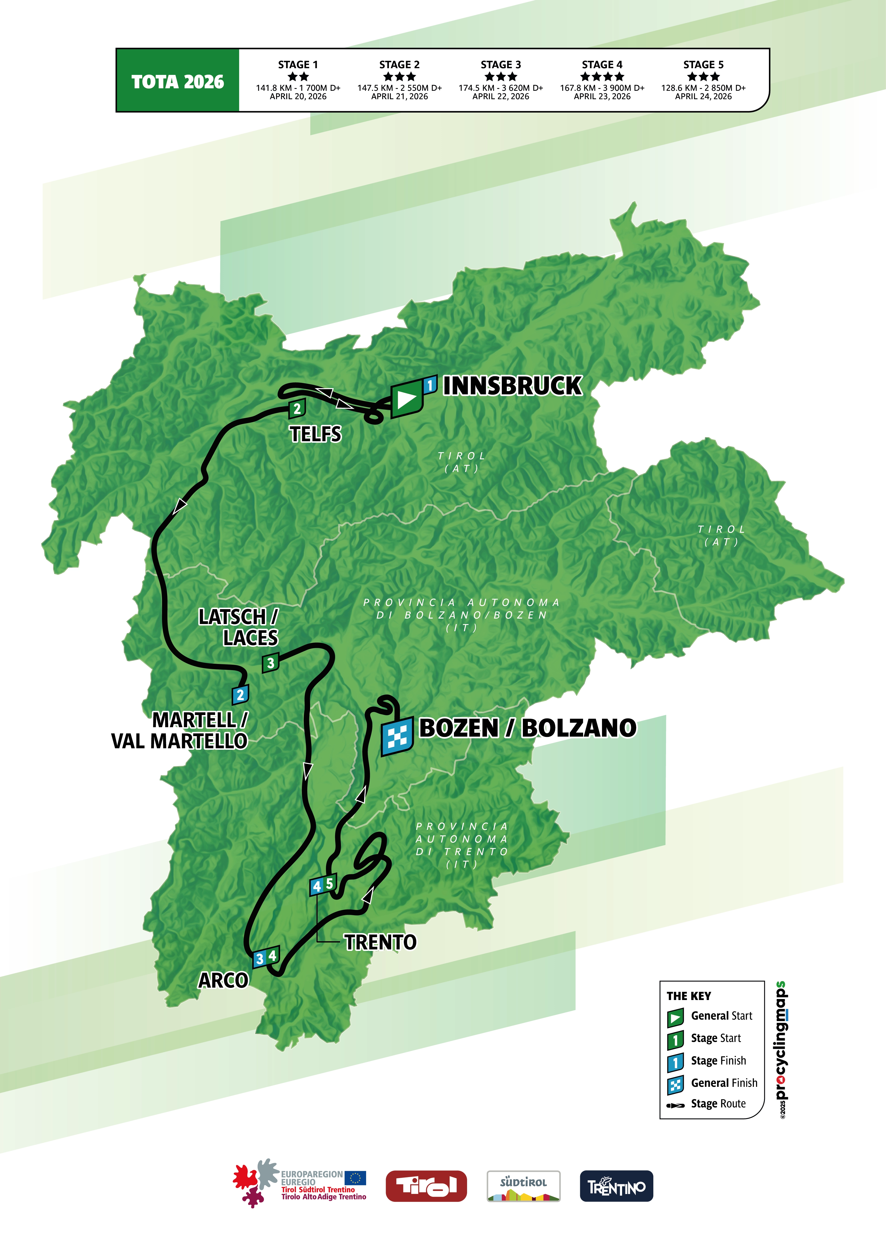 2026 marks the 10th anniversary of the cooperation agreement between Tirol, Südtirol/Alto Adige and Trentino and the race spanning the special Euroregion, with the Tour of the Alps building on the legacy of the Giro del Trentino race.