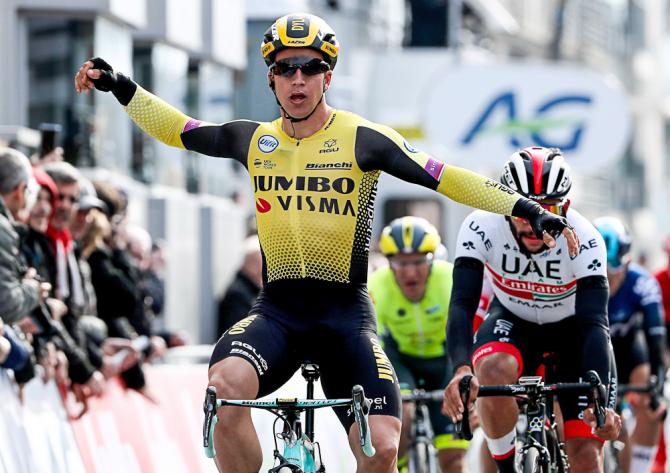 Dylan Groenewegen (Jumbo-Visma) chalked up another sprint victory for the season, topping Fernando Gaviria (UAE Team Emirates) and Italian champion Elia Viviani (Deceuninck-Quickstep) in the Driedaagse Brugge-De Panne.