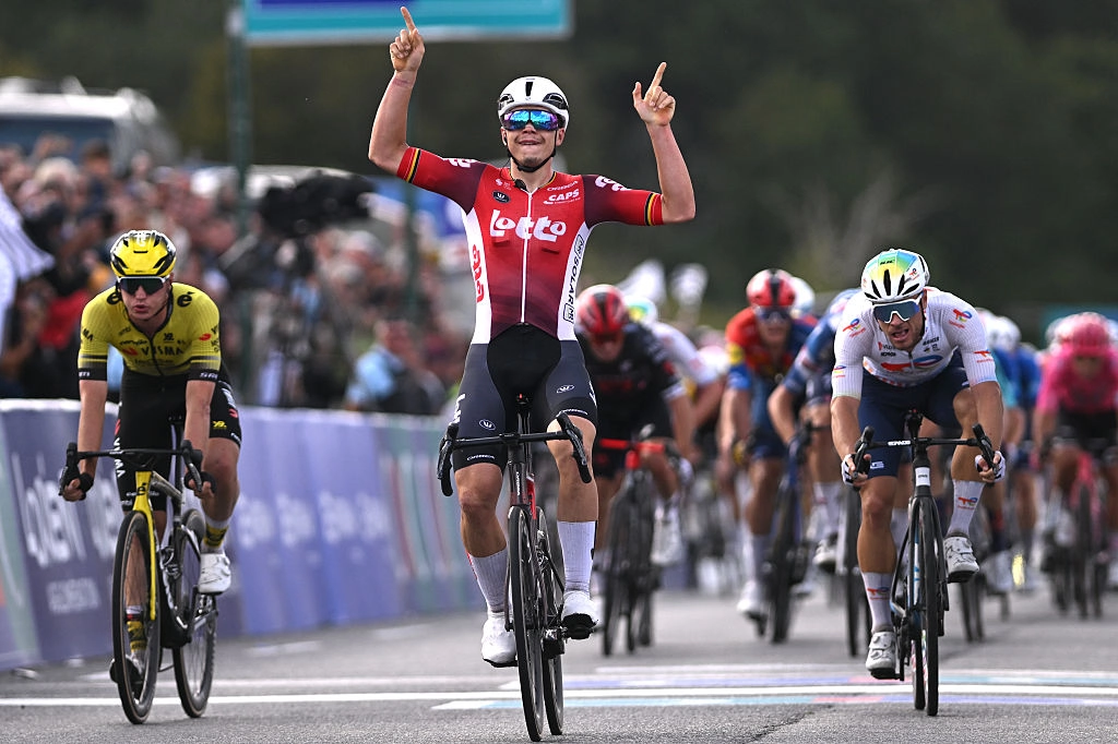 Arnaud de Lie (Lotto) timed his sprint perfectly, overtaking Olav Kooij (Visma-Lease a Bike) to win in Plouay. Emilien Jeannière (TotalEnergies) passed Kooij just before the line to snatch second place.