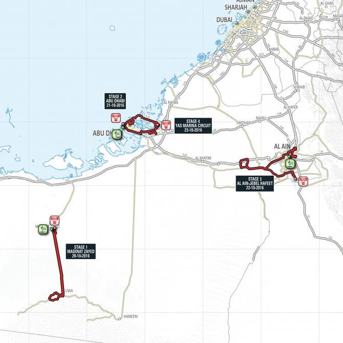 In 2016, the race opens with two stages suited for the sprinters with finishes in Madinat Zayet and Abu Dhabi.The stage 3 summit finish on Jebel Hafeet remains the queen stage of the race which has little change from the 2015 edition won by Esteban Chaves (Orica-BikeExchange). The race again concludes on the Yas Marina Circuit.