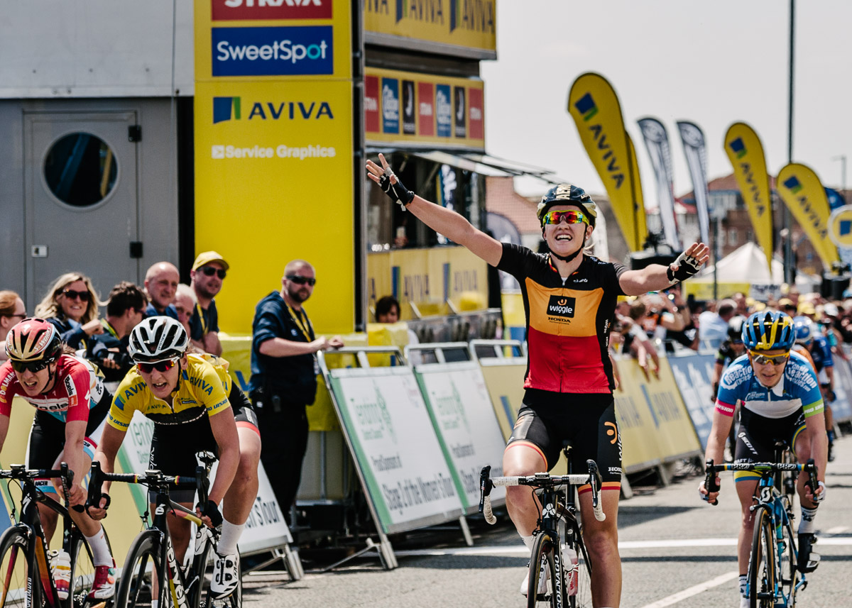 Jolien D'hoore (Wiggle-Honda) won stage 2 of the Women's Tour into Clacton as she beat Lisa Brennauer (Velocio-SRAM) and Christine Majerus (Boels Dolmans) in a bunch sprint on Thursday.