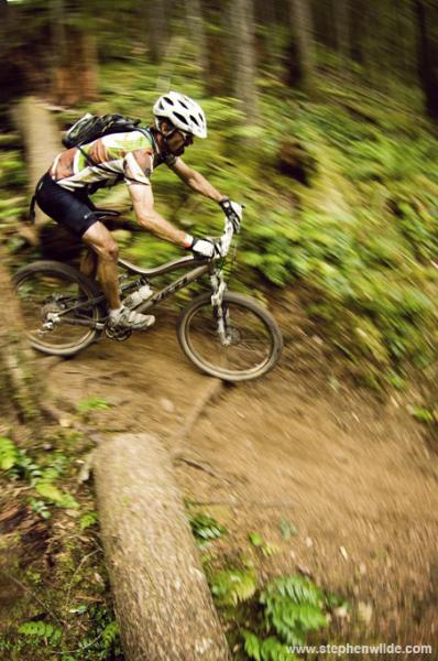 The day began in Cumberland’s Village Park (where it also ended) with a 22-plus mph roll out to the first singletrack, designed to thin the field but despite the fast pace there was still a clog in the drain as riders funneled down behind the heads of state. The initial lead group consisted of Rocky Mountain’s Chris Sheppard, Frenchman Thomas Dietsch of the Bulls team, Jamis’ Jason Sager, Kona’s duo team of Kris Sneddon and Barry Wicks and the Nativo/Devinci team consisting of Marty Lazarski and Ricky Fedderau.
