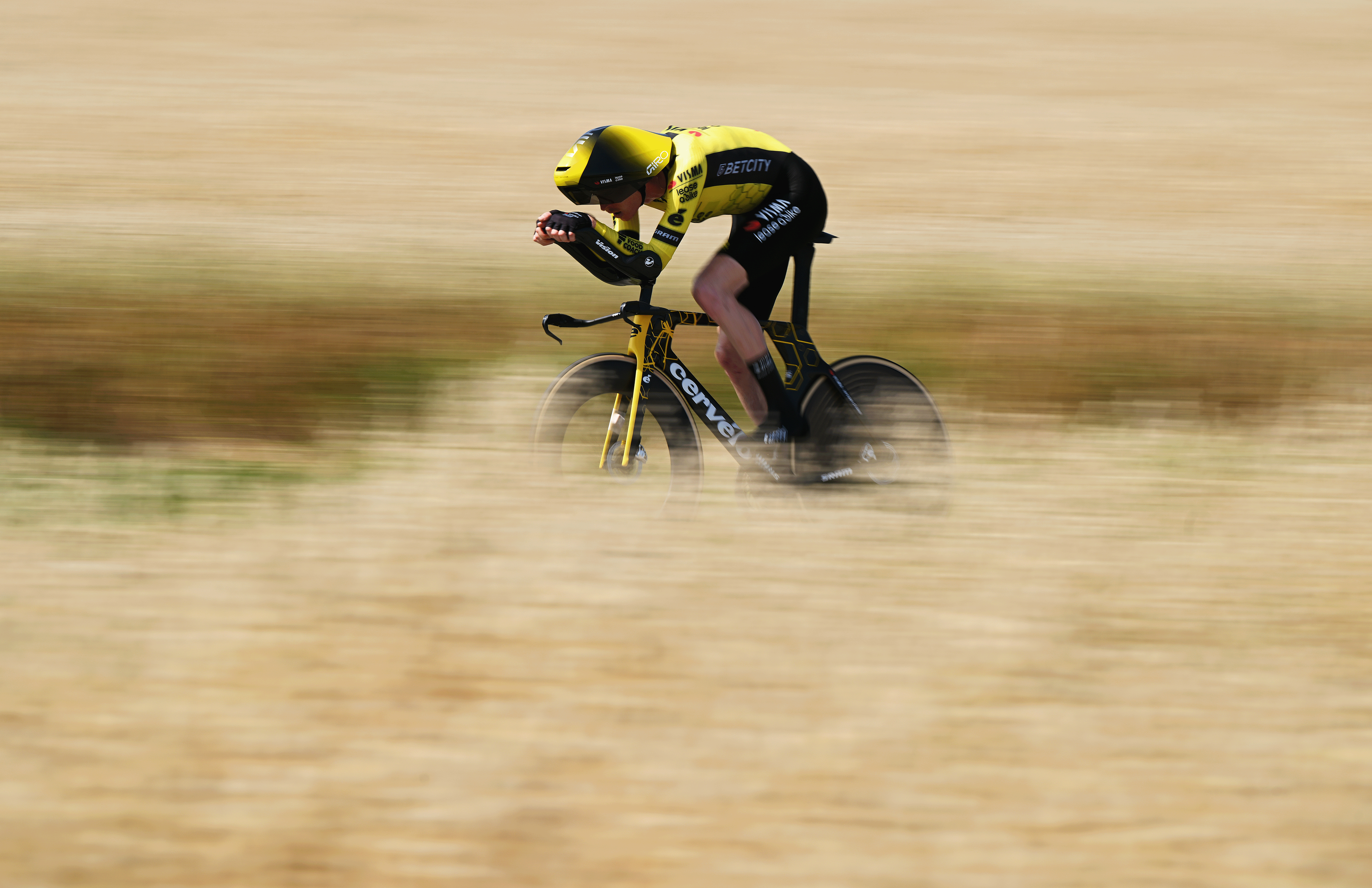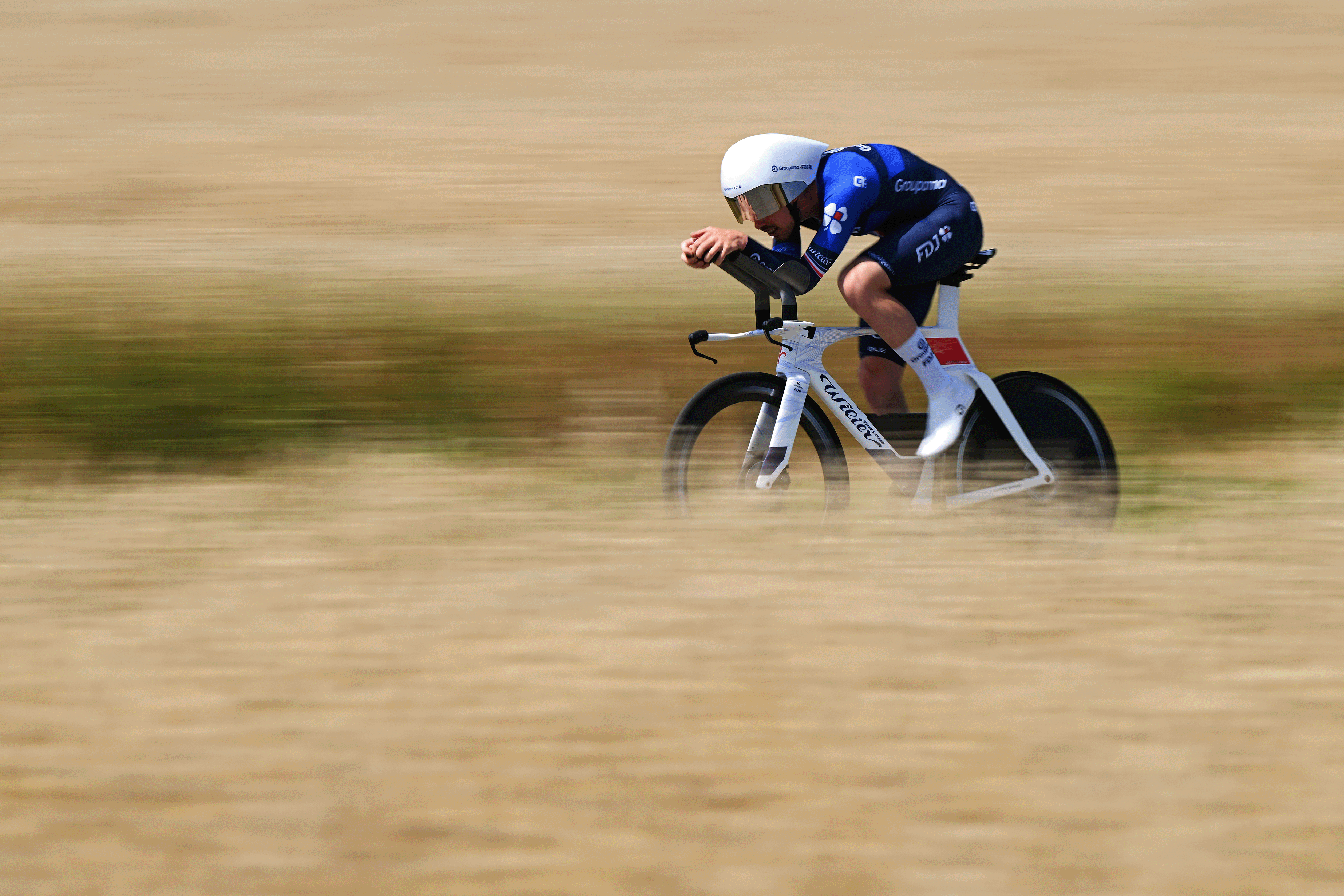 Foss has not been challenged by any of the recent finishers. Here's a look at him during the time trial, with his former world champion's rainbow bands on show at the end of his sleeves.
