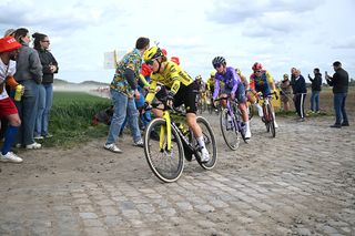 Mid-race scare for Tadej Pogačar after puncture, neutral spare bike sees race favourite off the back at Paris-Roubaix