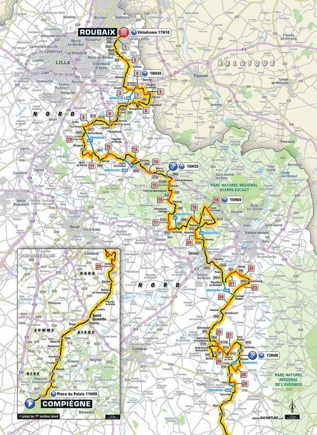 The action heats up in the Arenberg Forest after 162km, the first five-star secteur. The real contenders rise to the forefront at Mons-en-Pévèle, the next five-star track with almost 50km still to race. The Carrefour de l'Arbre with 26km remaining is a critical point to win or lose the race, which culminates in the famous Roubaix Velodrome.