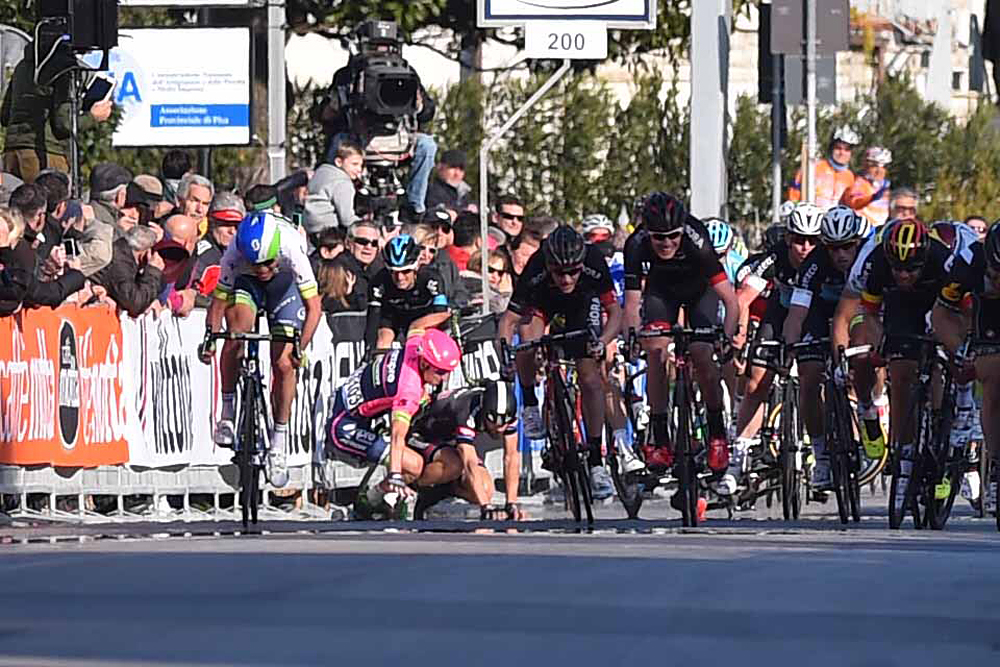 Jens Debusschere (Lotto-Soudal) won the second stage at Tirreno-Adriatico in a crash-marred bunch sprint in Cascina. Peter Sagan (Tinkoff-Saxo) was second and Sam Bennett (Bora-Argon 18) third, with riders from Giant-Alpecin and Team Sky going down in the crash.