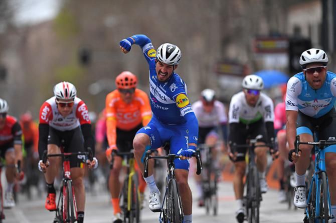 Julian Alaphilippe (Deceuninck-QuickStep) won stage 6 of Tirreno-Adriatico after sprinting to victory ahead of Davide Cimolai (Israel Cycling Academy), while his teammate Elia Viviani came from further back to finish third on the day.