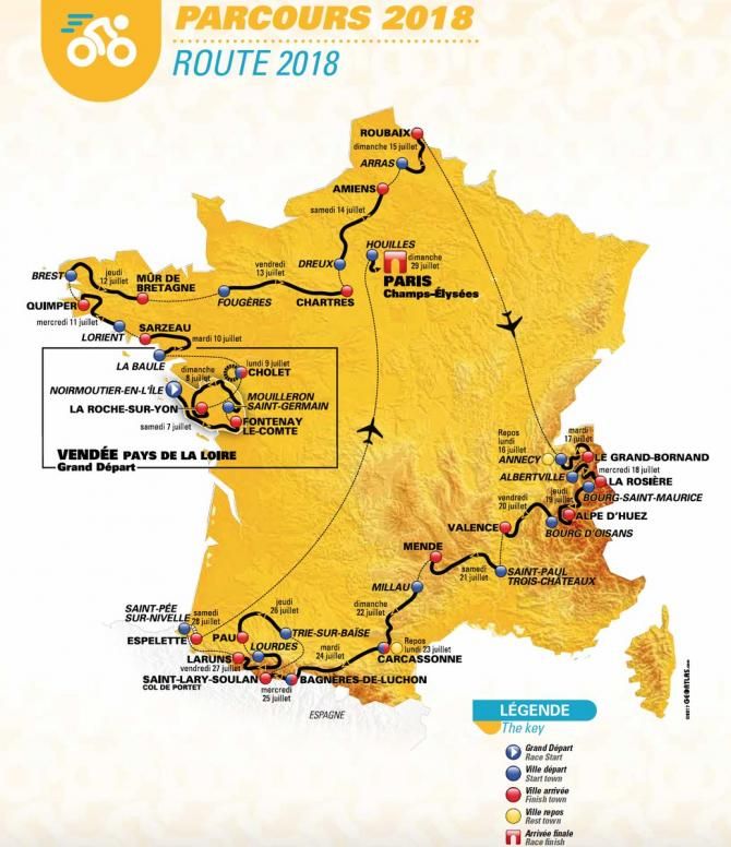 The 2018 Tour de France, the 105th edition of the race, will begin on July 7 in the Vendée region in north west France and will conclude in Paris on July 29. Over the course of 21 stages, the riders will face six mountain stages - three of which feature summit finishes - one individual time trial, one team time trial, eight flat stages giving opportunities for the sprinters, and five moderately hilly stages, all for a total distance of 3229km.