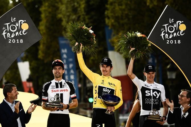Geraint Thomas (Team Sky) sealed his overall victory at the 2018 Tour de France, crossing the stage 21 finish line in Paris safely behind the sprinters, alongside his teammate, and third place overall, Chris Froome. Tom Dumoulin (Sunweb) secured second place overall after a hard-fought three-week battle for yellow.