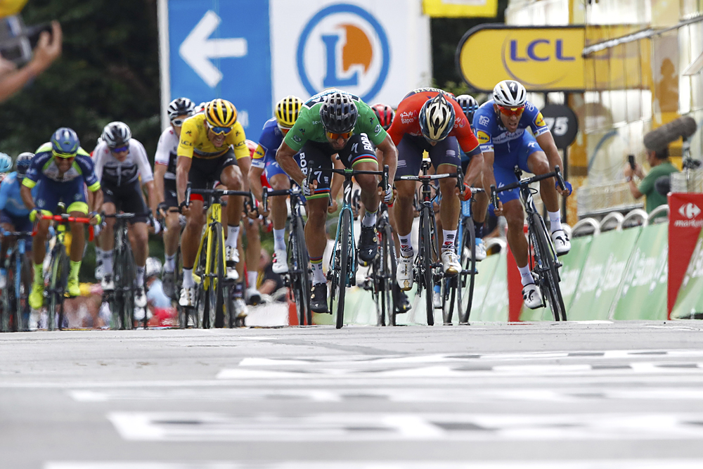 Peter Sagan (Bora-Hansgrohe) tightened his grip on the green jersey by claiming stage 5 of the Tour de France with a resounding sprint on the uphill finale in Quimper. The world champion timed his effort well on the drag to the line to beat Sonny Colbrelli (Bahrain-Merida) and Philippe Gilbert (Quick-Step Floors) to the stage honours, while Greg Van Avermaet (BMC) placed seventh to retain the yellow jersey.