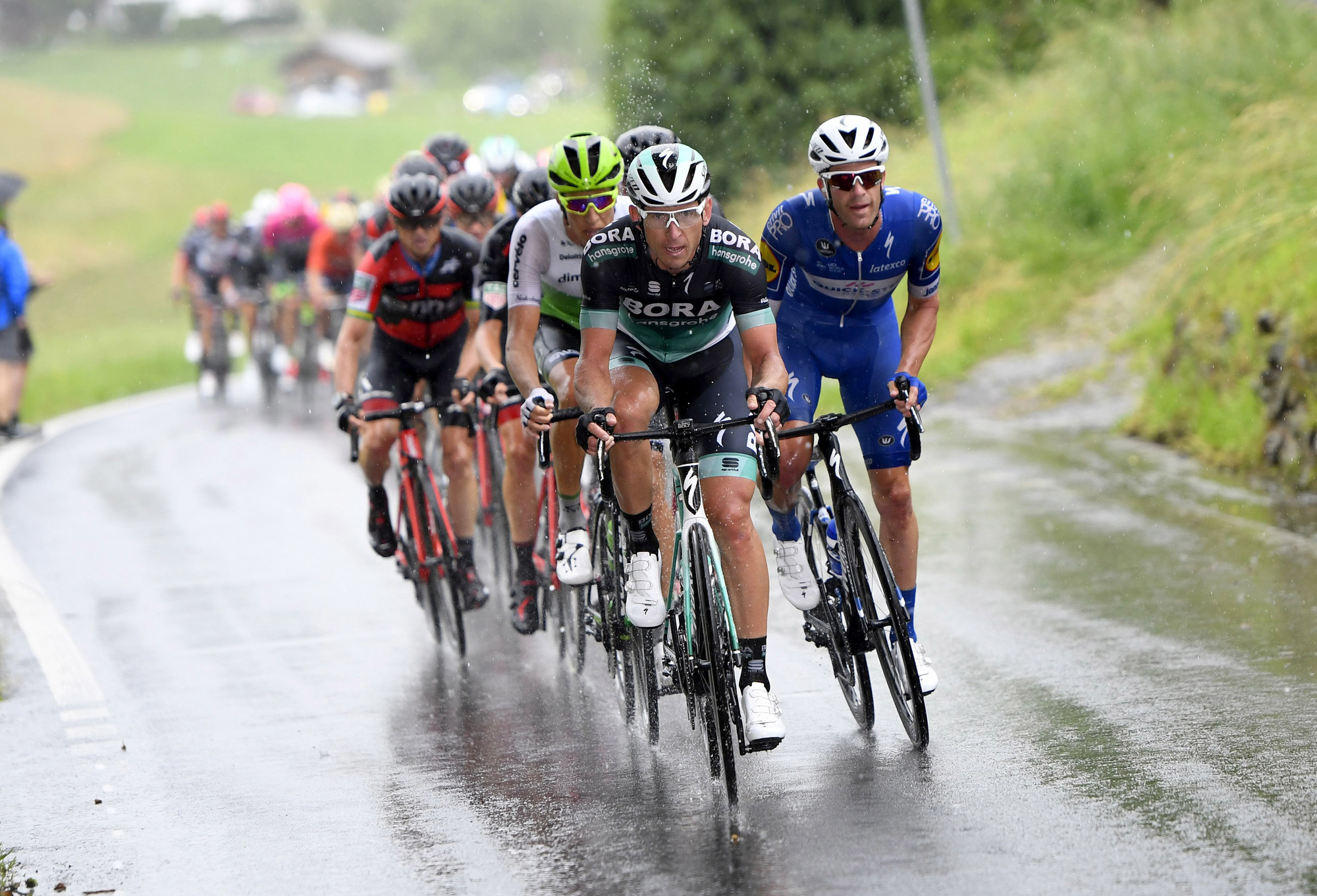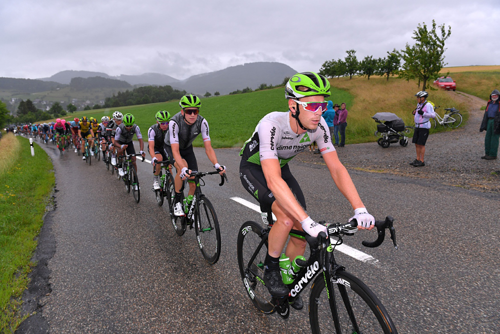 Sho Hatsuyama (Nippo-Vini Fantini) was also part of the move but was soon dropped and swept up by the BMC-led peloton. The gap rose rapidly, touching five minutes after just 13km, putting Dillier in the virtual race lead. Ourselin led the break over the top of the Staffelegg climb before the stage profile flattened and the stage settled. BMC was obliged to do much of the chasing to defend Kung’s yellow jersey but Quick-Step Floors stepped up to help with 75km to go and Bora-Hansgrohe did so a little while later. Iljo Keisse and Juraj Sagan did much of the hard work for the two teams and their sprinters, perhaps happy to be at the front and away from the continuous wheel spray.