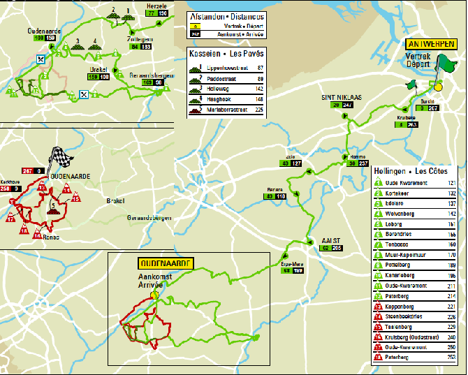 Although the route has undergone several changes over the event's history, and while the historic Muur-Kapelmuur in Geraardsbergen is included mid-route, it is the new spectator-friendly circuit around Oudenaarde with the repeats of the Oude Kwaremont and Paterberg that provide the spectacle and worthy winners: Tom Boonen, Alexander Kristoff, Fabian Cancellara, Peter Sagan and Philippe Gilbert, and now Terpstra.