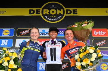 With her Sunweb team fully committed to her cause at the Tour of Flanders, American Coryn Rivera paid them back with a narrow sprint victory over Gracie Elvin (Orica-Scott) and Chantal Blaak (Boels Dolmans). Rivera, who also won Trofeo Alfredo Binda last month, struggled to comprehend what she had done in the immediacy of the victory, explaining in here post-race TV interview "I can't begin to explain it yet."