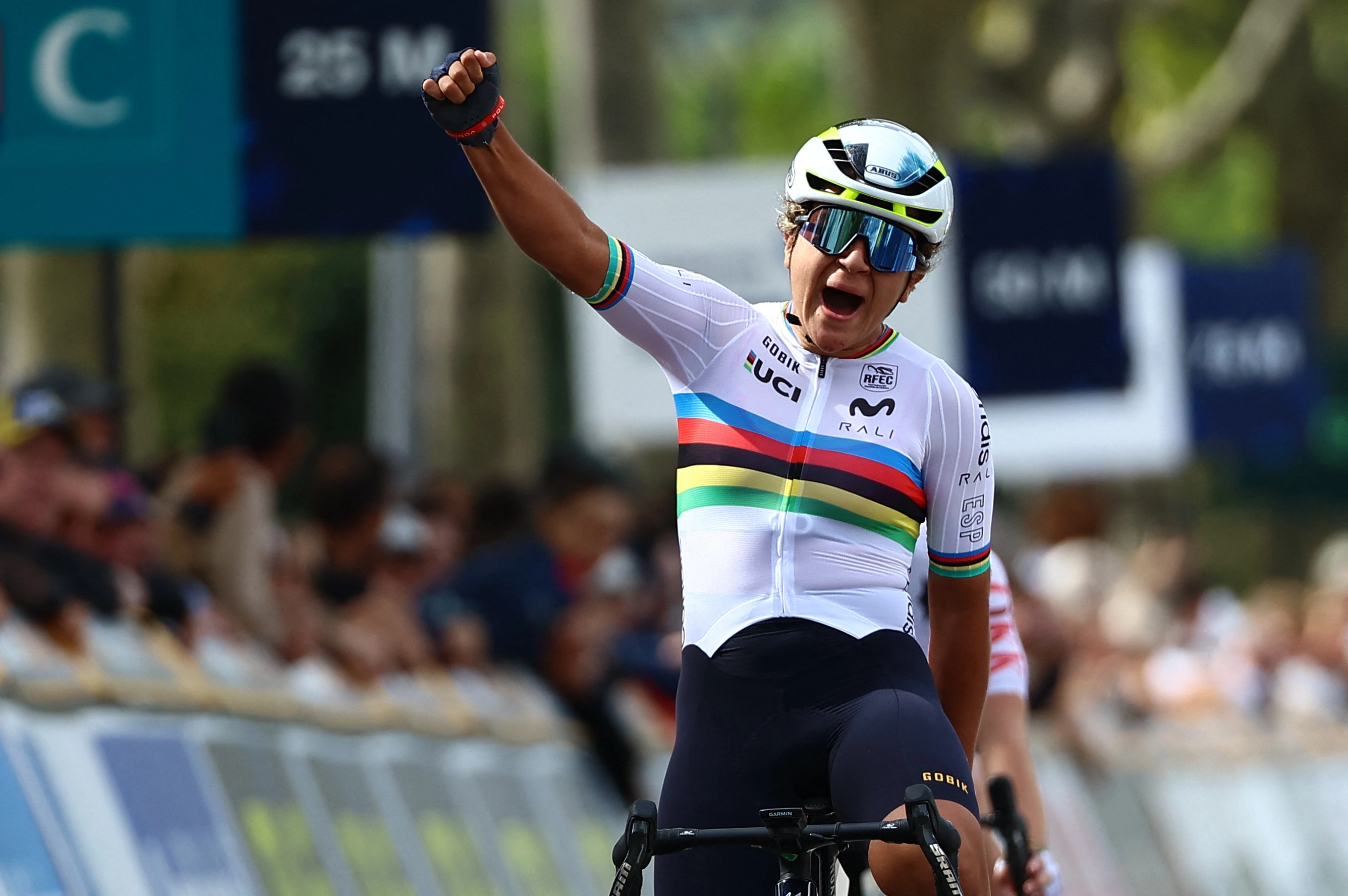 In her first outing in the rainbow jersey she claimed in Rwanda, Ostiz proved to be the strongest climber alongside Grossman during the 62km race, with the pair arriving at the line together. Ostiz came out on top and roared in celebration over the line.