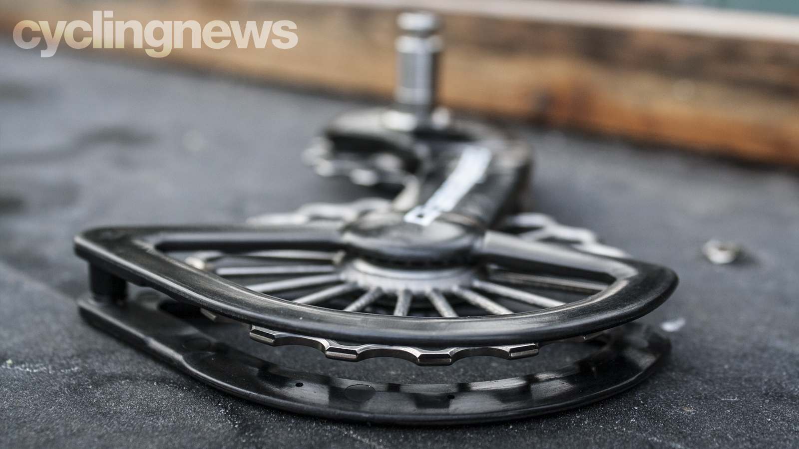 Closer inspection reveals its hallmark feature: the rather ornate 3D-printed titanium pulley wheels. Like the other (Shimano-compatible) models in the range, the pulley wheel arrangement comprises a 13T upper and 19T lower wheel - which is by far the most spectacular-looking design in the range. The size ratio of pulley wheels differs from manufacturer to manufacturer based on stock derailleur geometry and cycling discipline.